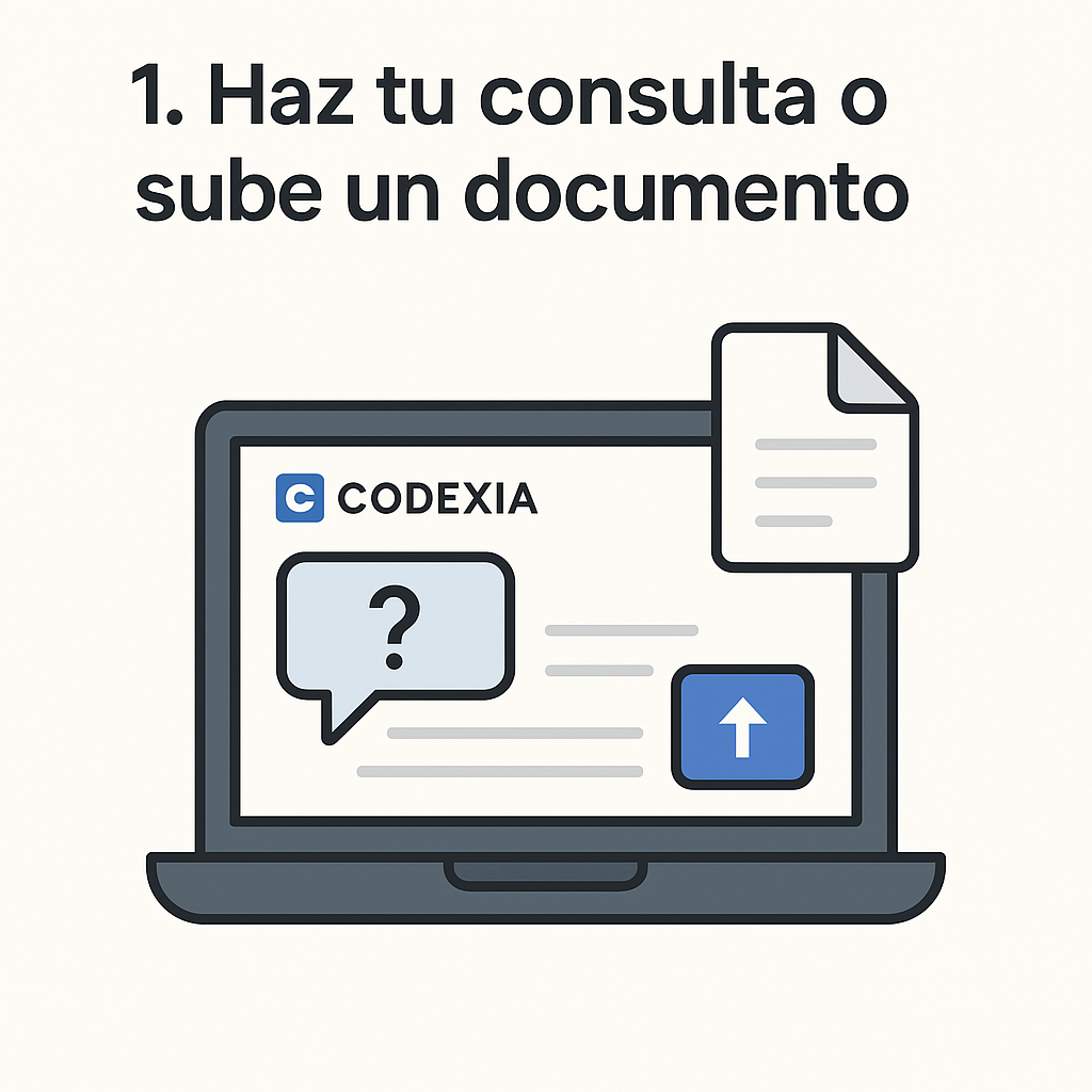 Accede al panel de Codexia y formula tu pregunta legal o carga el documento que deseas revisar: contratos, minutas, actas, reformas, etc.